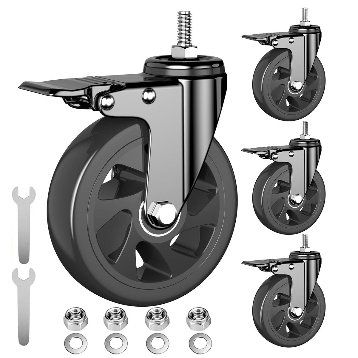 - CASTER SPECIFICATIONS : 5 inch Locking Swivel Casters, 1/2" -13UNC x 1" (Stem Diameter 1/2", Stem Length 1") threaded stem casters. Each no noise casters comes with free mounting hardware to help you assemble quickly. Please confirm the required screw specifications before purchasing 5 inch stem casters.