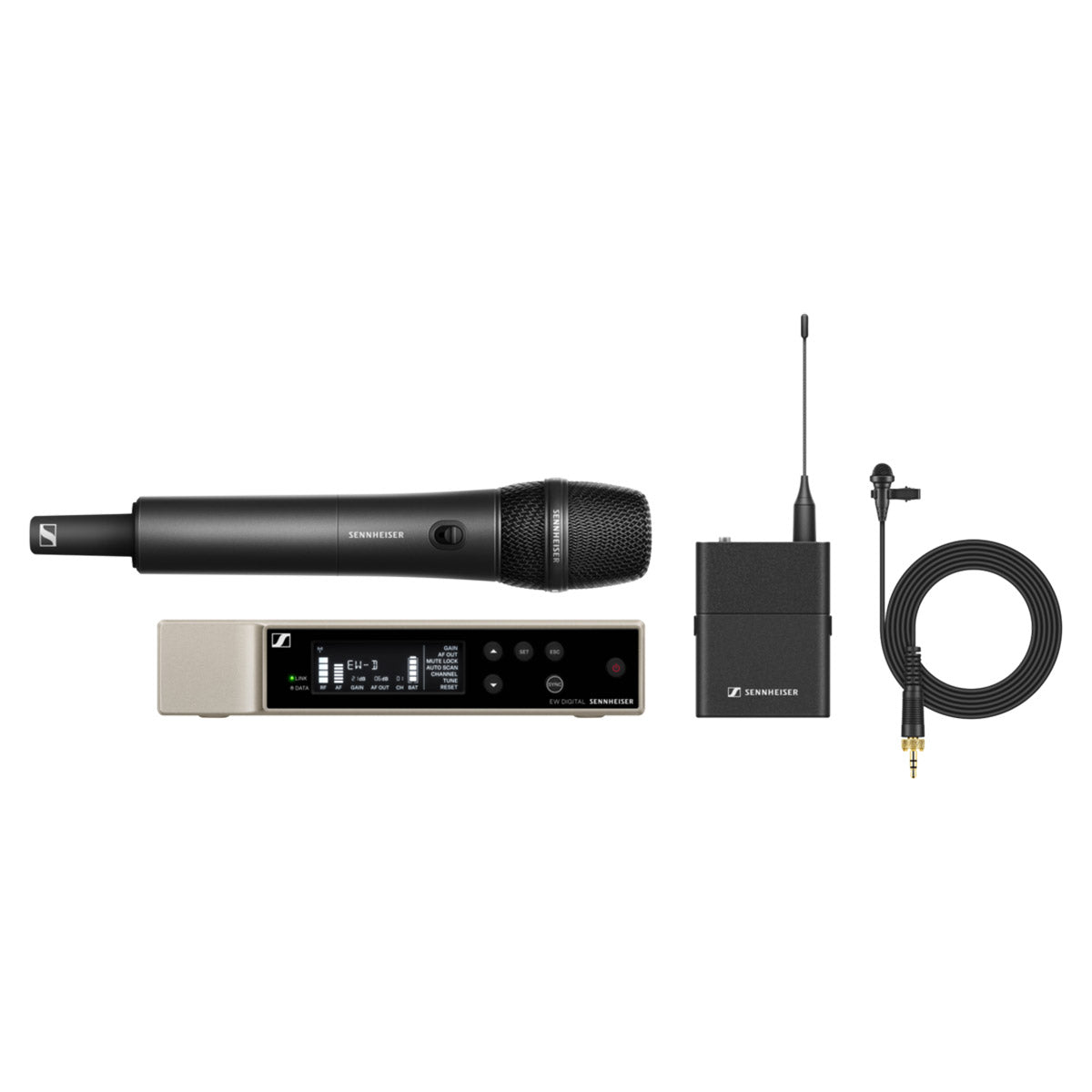 All-in-one combo set for digital wireless applications featuring sationary receiver, handheld transmitter and clip-on microphone.